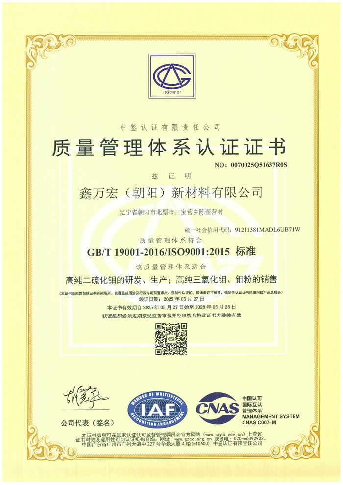 Thriving (Chaoyang) New Materials Co., Ltd. has passed IS09001 CERIFICATE OF CONFORMITY OF QUALITY MANAGEMENT SYSTEM CERTIFICATION.